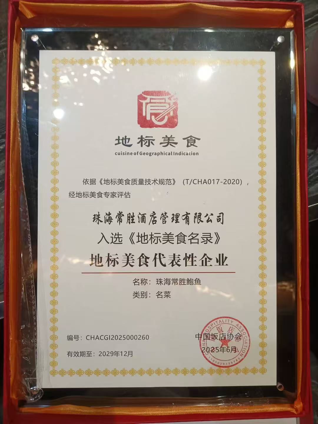 恭贺“常胜鲍鱼”荣获中国饭店协会颁发的地标美食称号,“珠海常胜酒店管理有限公司”荣获地标美食代表性企业。